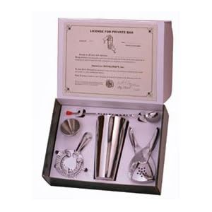 Bar Shoppe Professional and Home Bar Set. Contains lemon/lime squeezer, A 3/4 oz x 1-1/2 oz. jigger, 4-prong bar strainer, twisted bar spoon, cocktail shaker, 16 oz mixing glass with recipes, and personalizable "License For Private Bar". All-stainless steel.