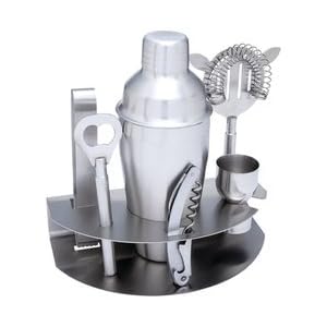 Set includes: cocktail shaker, strainer, bottle opener, corkscrew, double jigger, ice tongs, and stainless steel rack. Limited lifetime warranty. White box.